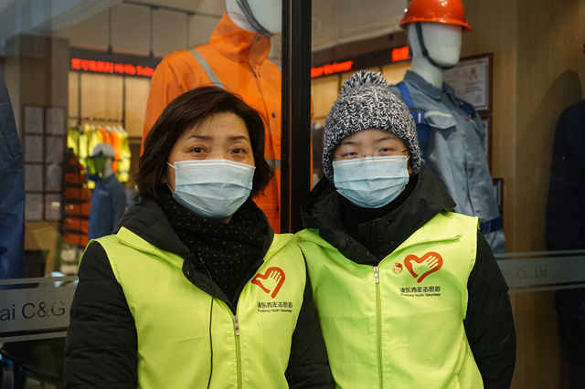 楊高虹和胡晨芳是一對(duì)母女,女兒是95后,媽媽是75后。她們?cè)缟?點(diǎn)半就到崗了,戴口罩、量體溫、登記、核查身份,全部通過后才能上崗。