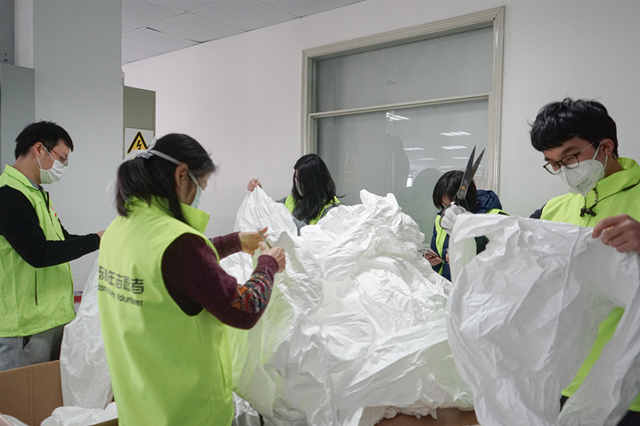 “我去年剛?cè)肓它h,看到這么多醫(yī)護(hù)人員奮戰(zhàn)在抗疫線,很感動(dòng),所以就想為他們做些什么,用實(shí)際行動(dòng)向他們致敬。”一件防護(hù)服的流程大致是:裁原料,縫紉,剪線頭,檢驗(yàn),貼商標(biāo),包裝,清點(diǎn),裝箱。當(dāng)志愿者的天,顧祥舜分配到的工作就是給防護(hù)服“剪線頭”。